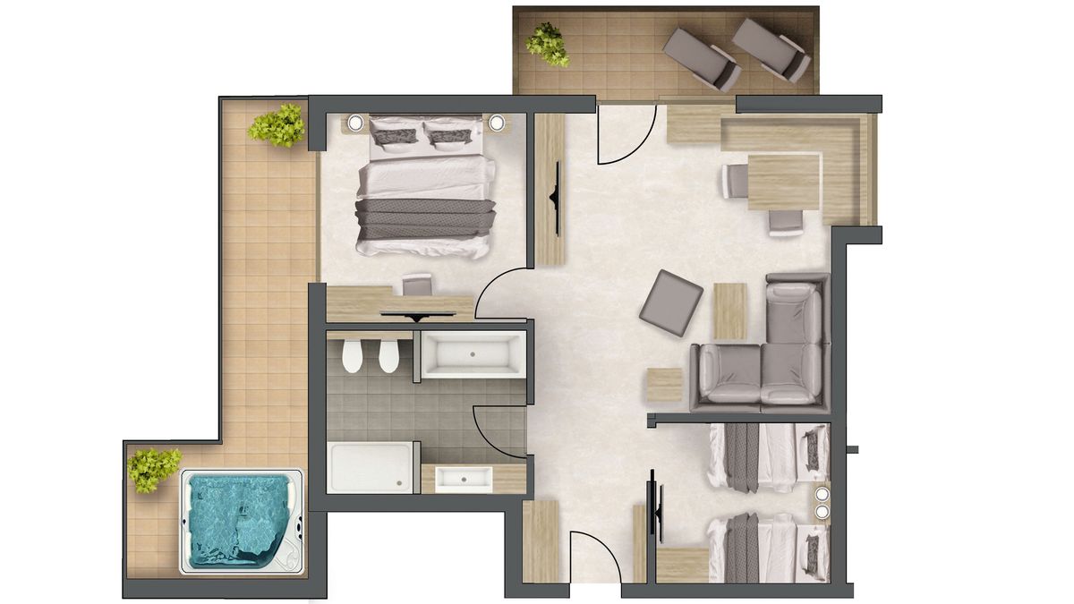 für 2-5 Personen, ca. 90 m² (davon 25 m² Loggia), Schlafzimmer, extra Kinderzimmer mit Stockbett und Einzelbett, Wohnraum inkl. Sitzecke und separatem Kuschelnest, Badzimmer mit Badewanne oder Dusche und Bidet, Nespresso-Maschine, Holzboden, Nordterrasse mit Whirlpool (beschränkte Aussicht). Tiefgarage im Guesthouse F inklusive.