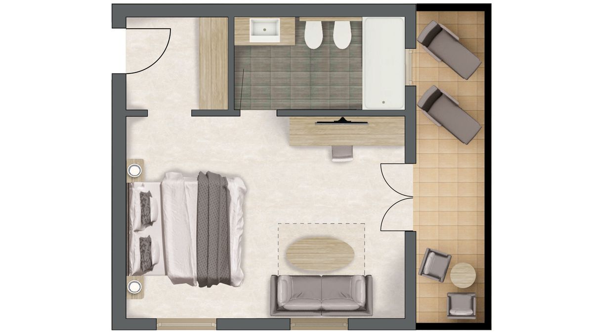 für 2-4 Personen, ca. 28 m², Doppelzimmer mit komfortablem Box-Springbett, Sitzecke mit ausziehbarer Couch (teilweise), Holzboden und Balkon. Tiefgarage unter den Tennisplätzen inklusive.