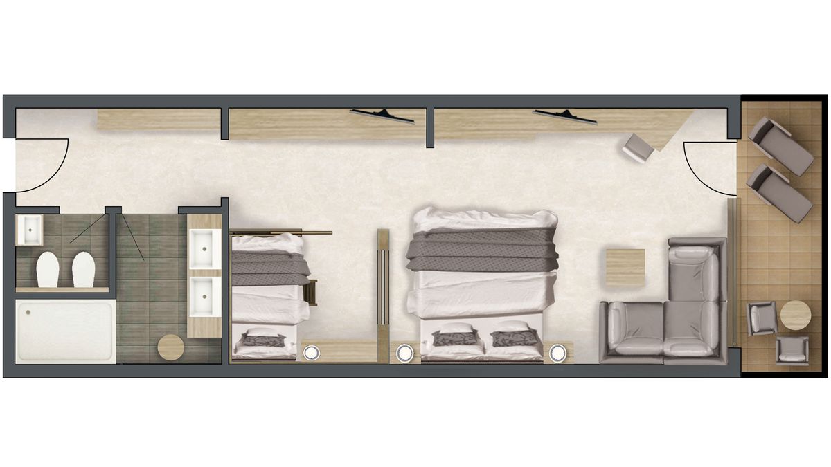 Für 2-4 Personen, ca. 50 m², mit komfortablem Box-Springbett und Sitzecke, separater Schlafkoje mit Stockbett, Holzboden und Balkon. Tiefgarage unter den Tennisplätzen inklusive.