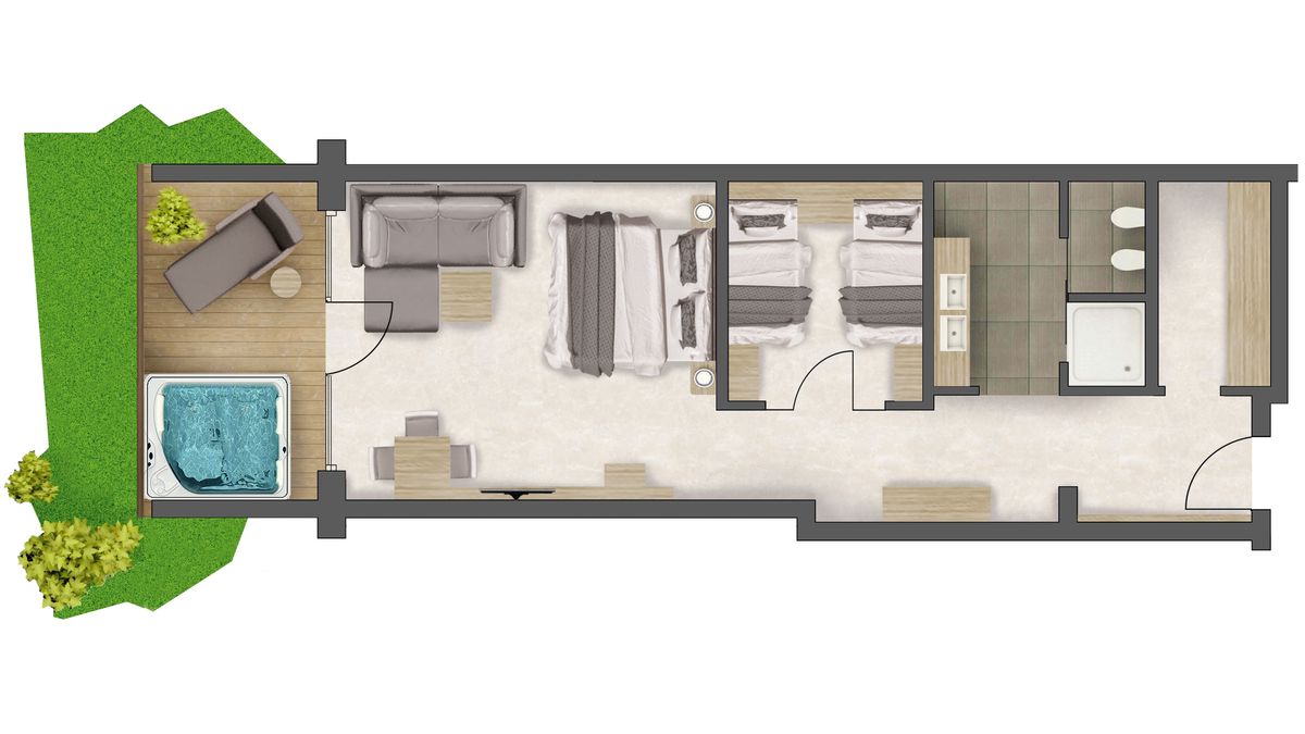 für 2-5 Personen, ca. 80 m² (davon 20 m² Loggia), Schlafzimmer inkl. Wohnecke, extra Kinderzimmer mit Stockbett und Einzelbett (ohne Fenster), Badezimmer mit Dusche, Tages-WC mit Bidet, begehbarer Schrank, Nespresso-Kaffeemaschine, Holzboden, Südterrasse im Parterre mit Relaxliegen und Whirlpool. Tiefgarage im Guesthouse F inklusive.
